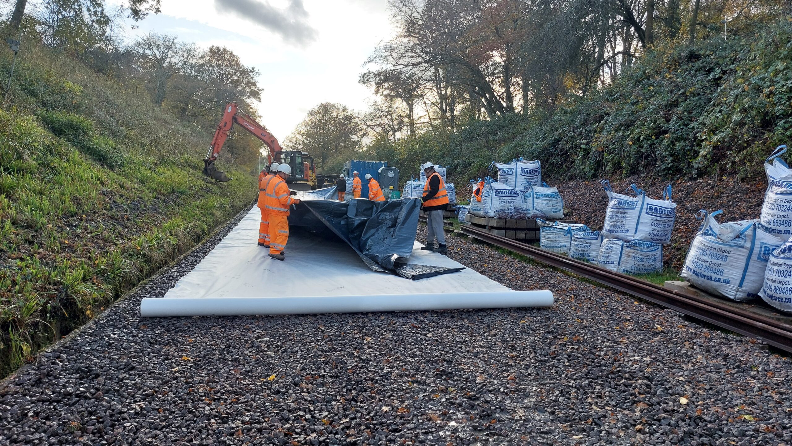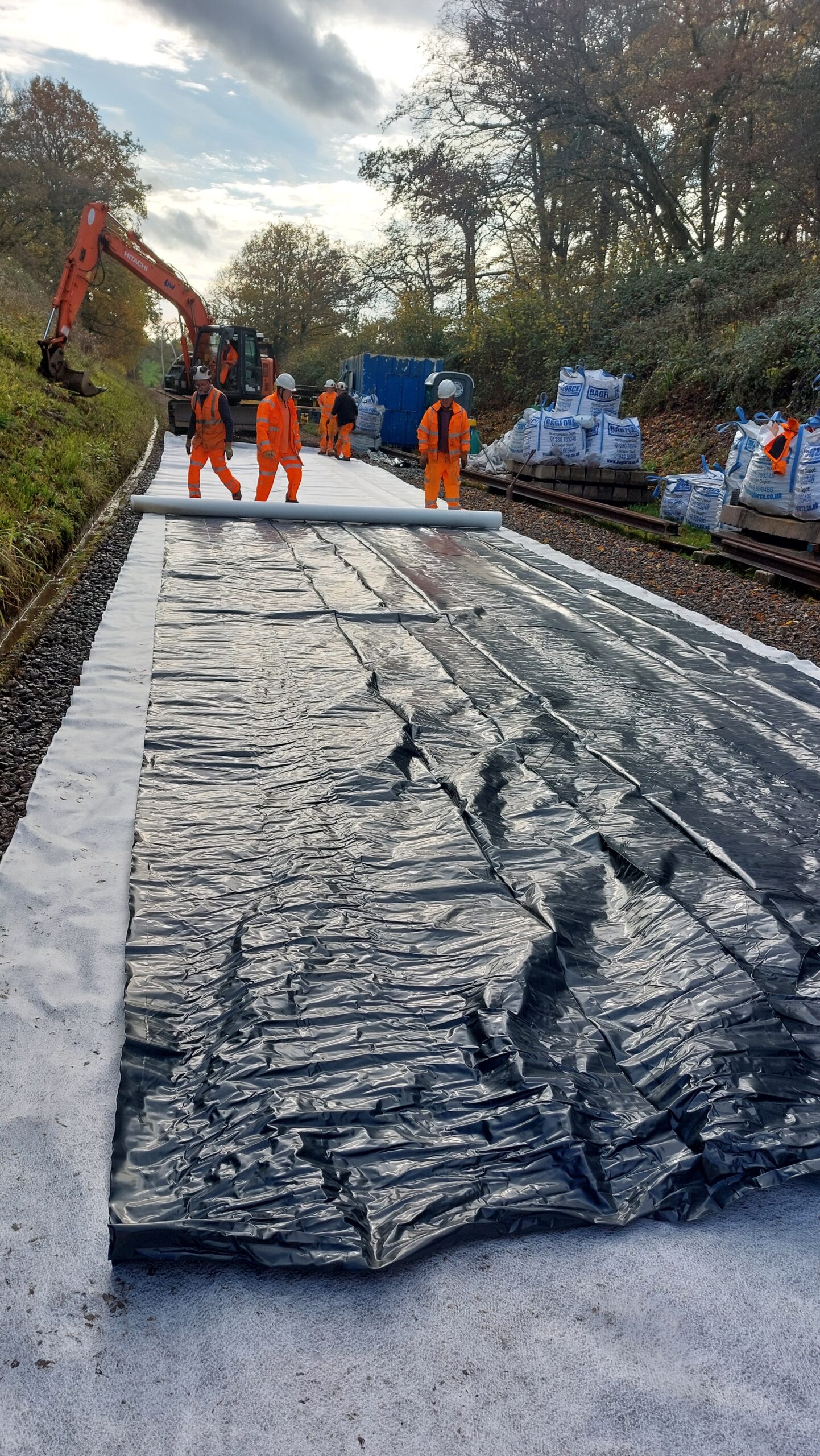 Track relays vary considerably in difficulty and this one is in the more complex category. The track and ballast need stripping out, the track bed needs compacting, a sandwich of terram (fibreglass), plastic and terram put down to ensure that water does not collect under the formation and drains correctly to the gulley along the east of the cutting.The relay is on a curve so the inner rail needs cutting to length.