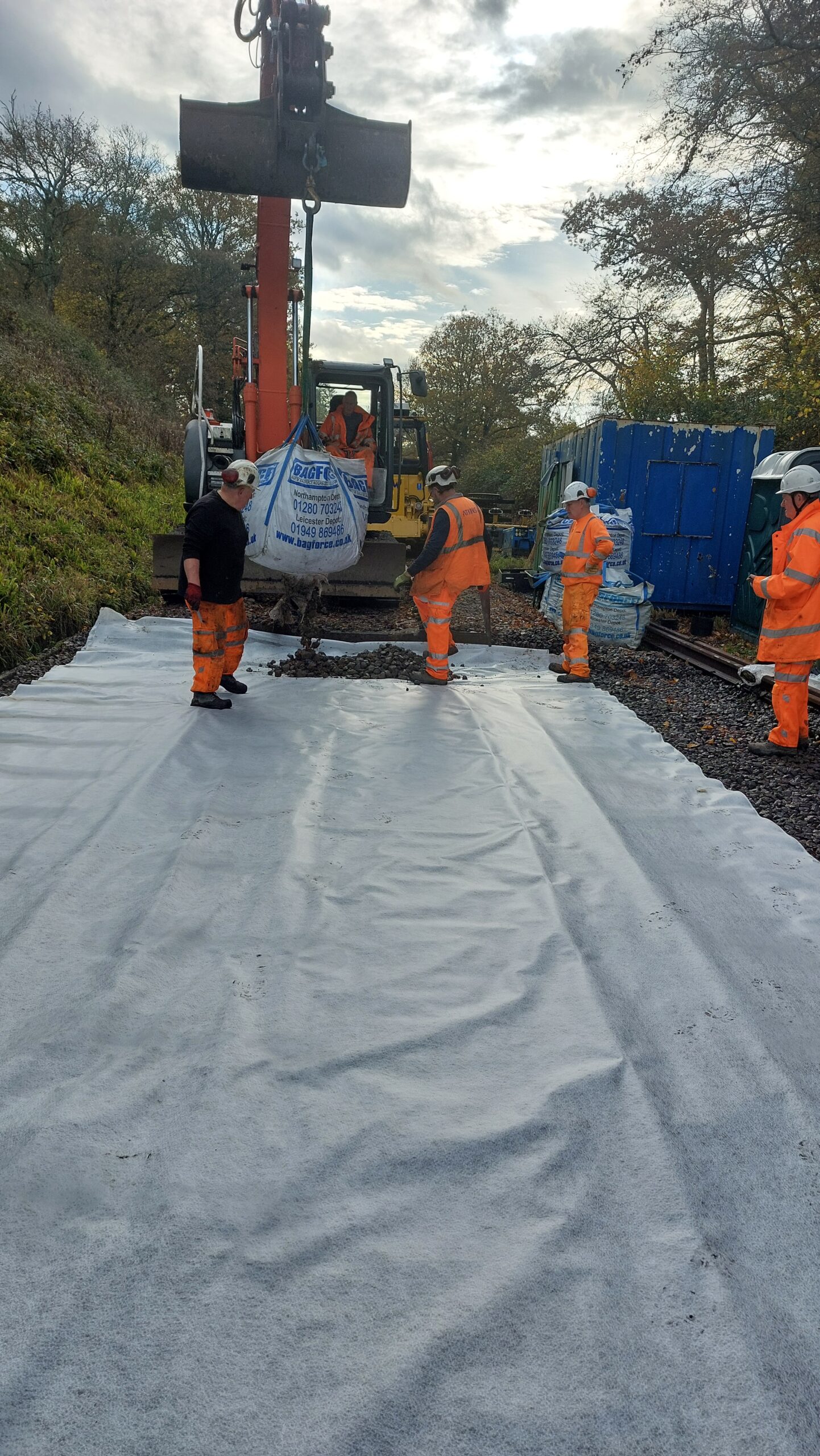 The Black Hut track relay is on schedule with all the old track removed and the ground prepared. The old track panels have been cut in half and stacked ready for transportation back to the yard at Horsted. The old ballast has been retained as an additional base for the relaid track. This will mean that the relaid track will intentionally be a few inches higher than before. A sandwick of terram (firbrgalss), plastic and terram is laid on top of the old ballast to ensure that water does not collect under the sleepers and the new ballast laid on top.