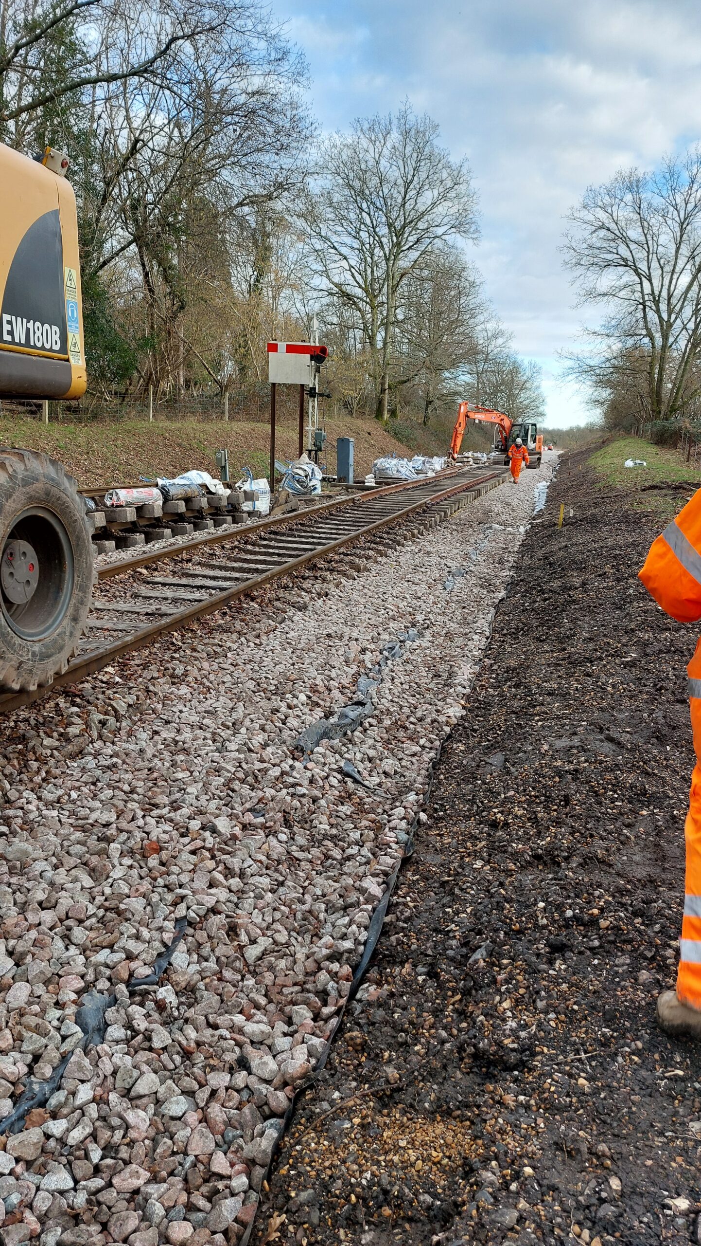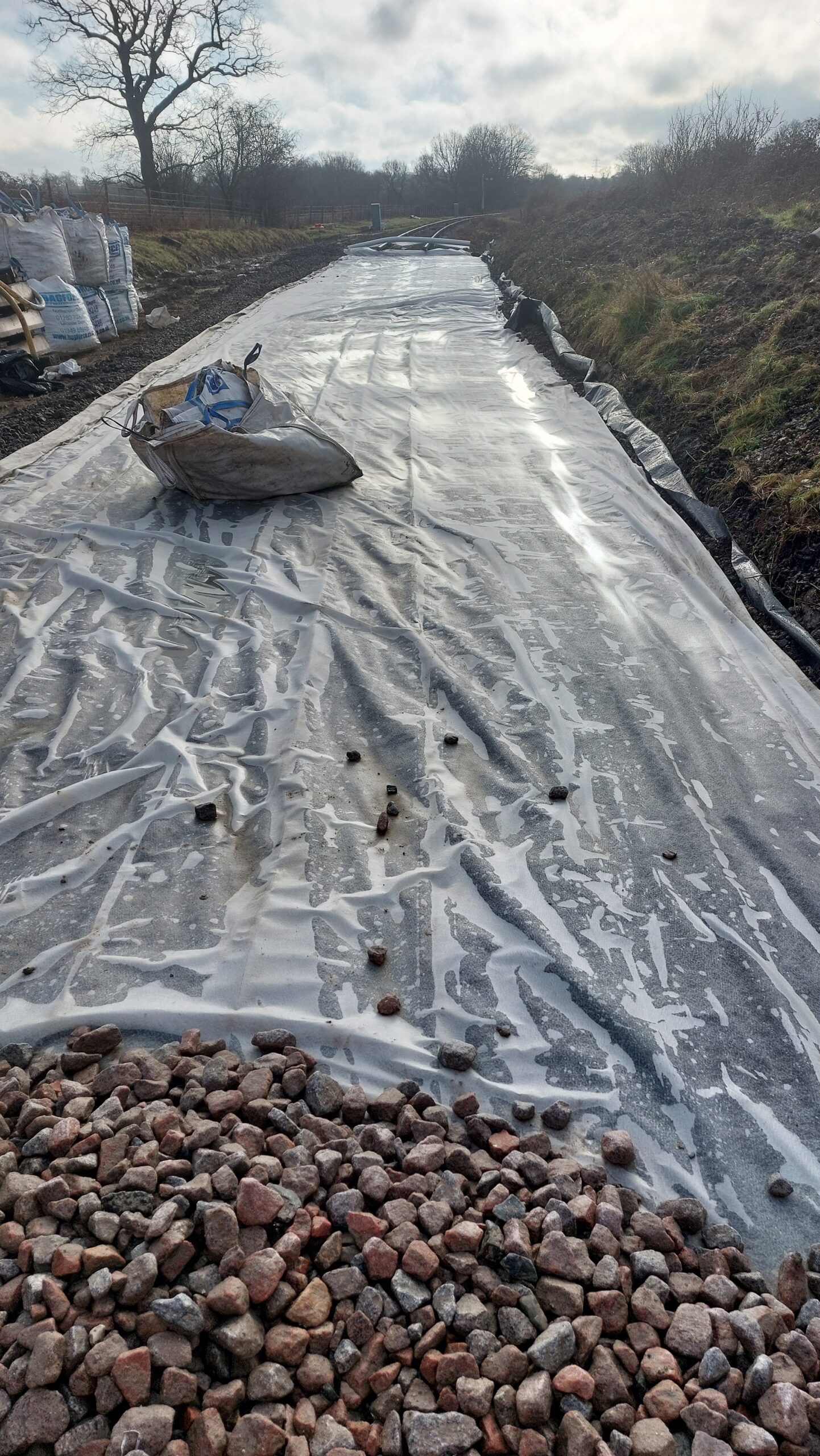 Taking place in a cutting, the usual terram, plastic. terram sandwich was required to ensure that the new formation would be dry. The cutting has long suffered from boggy conditions and an insufficient bed of good quality ballast which was why there was a long standing speed restriction on this section of the line which will soon be removed.