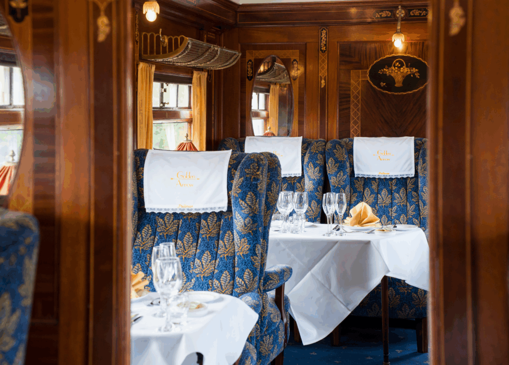 Breakfast silver service dining aboard the Bluebell Railway’s Golden Arrow train.