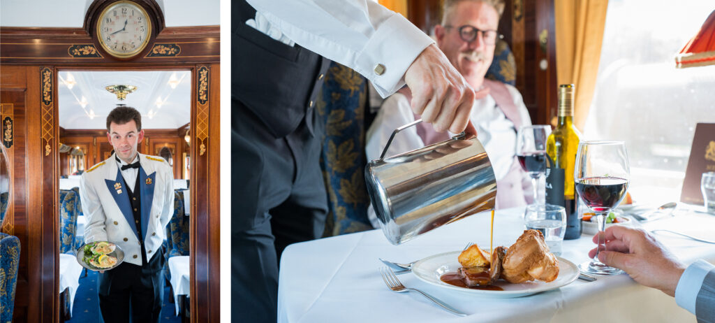 Evening silver Service dining on board the Golden Arrow Pullman.
