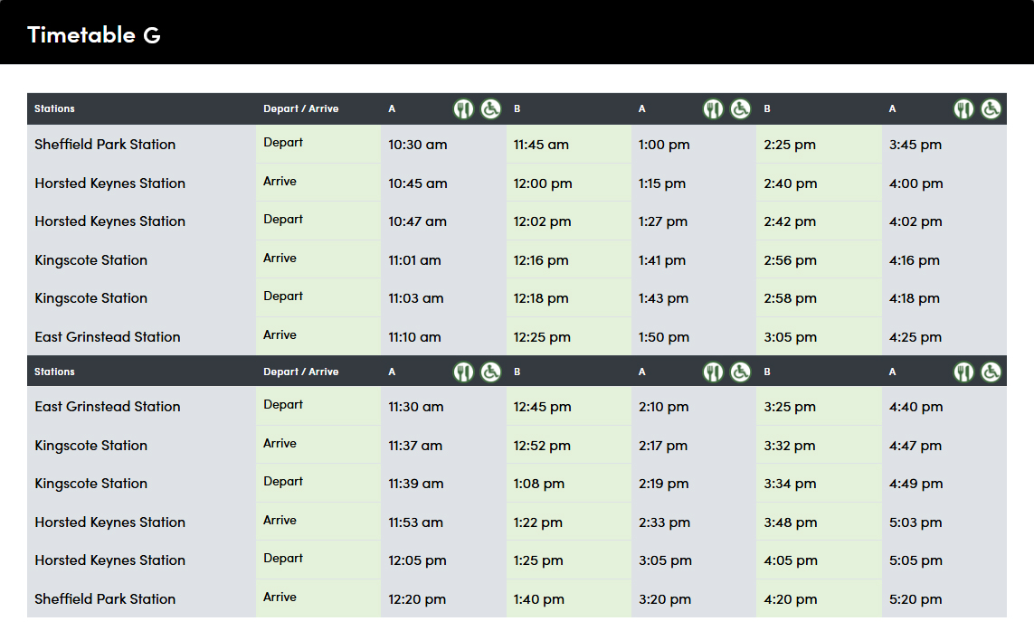 - Arrive: 12:00pm (via 11:45am from Sheffield Park)